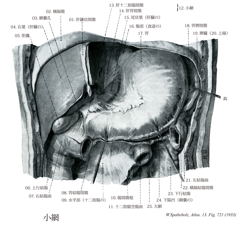 →(肝門と胃小弯および十二指腸上部の間に張る前後2葉からなる薄い腹膜で、胃の小弯から十二指腸の近位部(幽門より2cm遠位)と肝臓(肝門縁と静脈管索のある裂隙深部)とに付着したもの。発生的に前胃間膜の一部である。右側端は肝十二指腸間膜といい、小綱の自由縁ならびに網嚢孔の前縁を形成し、ここを胆路、門脈、固有肝動脈が通る。左側の広い部分は胃小弯とつらなり、肝胃間膜といい、網嚢の前壁を形成する。なお小綱の右側端はしばしば、十二指腸の前面を越えてヒダとして下行して右結腸曲に達することがある。これを肝結腸間膜という。小綱の左端部は肝臓から外れるので、ここでは小綱が胃と横隔膜を結ぶ形となる(小綱の横隔胃部pars phrenicogastrica)。)