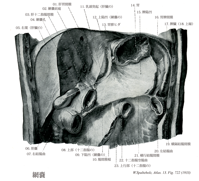 - 722_00【Omental bursa; Lesser sac; Lesser peritoneal sac網嚢;腹膜の小嚢 Bursa omentalis】 Largest pocket within the peritoneal cavity, located behind the stomach and lesser omentum.