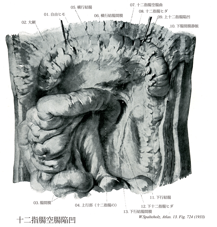 724_08【Superior duodenal fold; Duodenojejunal fold上十二指腸ヒダ;十二指腸空腸ヒダ;上十二指腸結腸間膜ヒダ Plica duodenalis superior; Plica duodenojejunalis; Plica duodenomesocolica cranialis】 Peritoneal fold on the left side of the duodenojejunal flexure in front of the superior duodenal fossa. It contains the inferior mesenteric vein. →(十二指腸空腸曲の左方で上十二指腸陥凹の前方にある腹膜ヒダ。下腸間膜静脈を包む。 (Feneis))