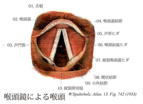 742_03【Rima glottidis声門裂;声帯裂 Rima glottidis; Rima vacalis】 Fissure between the two arytenoid cartilages and the vocal folds. →(声門裂は声門ヒダによって境された前3分の2の膜間部と、披裂軟骨によって境された後ろ3分の1の軟骨骨部とから構成されている。)