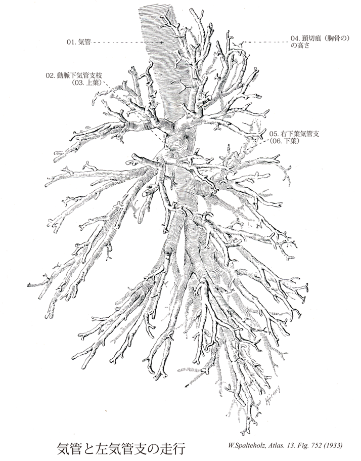 752_05【Right inferior lobar bronchus右下葉気管支 Bronchus lobaris inferior dexter; Stammbronchus】 It supplies the right inferior lobe, which extends posteriorly up to the level of the fourth rib. →(右下葉気管支は後は第四肋骨までの右下葉へ向かう葉気管支で上-下葉枝(B6)、内側肺底枝(B7)、前肺底枝(B8)、外側肺底枝(B9)、後肺底枝(B10)よりなる。)