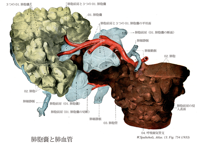 →(肺胞は呼吸器系の機能の中心であり、肺の実質として最も重要な部分である。肺胞は、呼吸細気管支、肺胞管、肺胞嚢にある薄壁の袋状拡張部で、そこを通して肺胞内の空気と肺毛細血管の間でガス交換が営まれる。基底膜basal laminaとその上をおおう上皮と、上皮の表面をさらにおおう被覆層と、気道部分の肺胞腔alveolar lumenとから成る。肺胞の外側には毛細血管網がとりまき、肺胞との間でガス交換の場を作っている。肺胞同士は非常に接近しており隣り合う2つの肺胞は、肺胞中隔内の1つの毛細血管網を、その接する面で両方から共有する。①肺胞上皮alveolar epithelium:肺胞の表面をおおう上皮をいい、3種類の上皮細胞で構成される。体重70kgの成人男子では2.6~3億個の肺胞がある。1個の肺胞の表面積は平均270,000μm2であるので、1人当たり全体で70~80m2の表面積を有することになり、広い面績で空気と接触するのである。肺胞上皮細胞はⅠ型細胞、Ⅱ型細胞、Ⅲ型細胞の3種類で、その構成はそれぞれ、39%、60%、1%以下、である。しかしⅠ型細胞の表面積は1個当たり2,290μm2で、Ⅱ型細胞のそれは63μm2である。したがって1個の肺胞の表面積の95.8%はⅠ型細胞が占めている(259,000m2)。Ⅰ型細胞Type I cellは、Ⅰ型肺胞上皮細胞Type I alveolar epithelial cell、扁平肺肺細胞squamous pneumocyte、A型細胞Type A cell、小肺胞細胞small alveolar cellなどの名がある。細胞質は非常に薄い扁平な細胞である。細胞質の幅は100μmにもなる。細胞は互いに閉鎖帯で接着し、間質内の毛細血管の内皮細胞endothelial cellと基底膜を介して接し、血液-空気関門blood-air barrierを形成する。この部分で、肺胞腔の呼吸から酸素分子が血液中の赤血球erythrocyteに渡されヘモグロビンhemoglobinと結合し動脈血になる。一方、静脈血中の血漿炭酸イオン(HCO3-)として溶け込んでいた二酸化炭素は、血液-空気関門から呼気中へ放出される。これがガス交換であり、血液が肺胞空へ漏れることはない。パラフィン切片上では、Ⅰ型細胞の核の部分しかみることができず、小さな細胞の印象を与えるが、実際には細胞質膜が毛細血管の上をおおっているのが電顕的に確認される。ヘマトキシリンで濃青色に染まった扁平な核が肺胞腔へ突出しているのがⅠ型細胞の核であり、肺胞中隔内へ向いているのが内皮臍傍のそれである。Ⅰ型細胞の機能は上記のガス交換以外に、血管と肺胞腔との間の蛋白質や多糖などの物質の輸送や肺胞腔内の高分子物質の取り込みendocytosisなどがある。血漿アルブミンや酵素の輸送には胞飲小胞pinocytotic vesicleが関与する。Ⅱ型細胞Type Ⅱ cellは、Ⅱ型肺胞上皮細胞Type Ⅱ alveolar epithelial cell、顆粒肺細胞granular pneumocyte、大肺胞細胞great alveolar cell、B型細胞Type B cellなどの名がある。立方細胞で細胞頂に短い微絨毛がある。細胞質内に電子密の高い層板小体lamellar bodyと呼ばれる分泌顆粒をもつ。この顆粒はリン脂質dipalmitoylphosphatidylcholineに富み、開口分泌により肺胞腔に分泌されて肺胞表面活性物質alveolar surfactantとなり肺胞被覆層の主成分になる。パラフィン切片では肺胞腔側に突出した円形の細胞であり、多くの場合泡末状の細胞質を有する細胞として認められる。Ⅱ型細胞を特徴付ける細胞小器官としてペロキシゾームが電顕的に確認される。Ⅱ型細胞は分裂能を有しており、他の細胞(Ⅰ型細胞)に分化し得るので、肺胞のリザーブ細胞reserve cellと言われている。Ⅲ型浅部Type Ⅲ cellは比較的最近(1960年代)に確認された細胞で、立方形のずんぐりした細胞の細胞頂に200nm幅の太い微絨毛(通常の微絨毛は100nm幅)を有する細胞である。光顕的に識別することは不可能である。ほとんどの場合、Ⅱ型細胞の傍らに位置する。電顕的に、細胞室内に10nmの張原細線維の束を見ることができる。胞体の基底側には求心神経終末が接しており、肺胞の化学受容器chemoreceptorと考えられている。肺胞被覆層alveolar lining layerは方法ではすべての細胞は空気に直接さらされているのではなく、肺胞被覆層によって保護されている。肺胞被覆層は通常の浸漬固定標本では溶出して観察できないが、肺動脈からの還流固定によって保存され、主に電顕的に観察できる。肺胞被覆層がよく保存された状態の時は、肺胞内腔はほぼ完全な球形を呈する。肺胞被覆層の厚さは変化に富み、血液-空気関門部のⅠ型細胞の薄膜状の細胞質上では50~100nmの薄さであるが、Ⅰ型細胞とⅡ型細胞との接着部分のくびれでは数μmの厚さに達する。電顕で観察すると、肺胞腔に面したオスミウム好性な表面薄膜osmiophilic surface filmとその下部で上皮上皮をおおう基層base layerとから成る。表面薄膜は不飽和脂肪酸を含むリン脂質の単層膜monolayerでミセルを形成し、表面活性効果を発揮して肺胞に含まれる水分の表面張力をうち消すことで、肺胞がつぶれるのを防いでいる。このような性質を有するリン脂質を肺胞表面活性物質と呼ぶ。基層の部分にはリポ蛋白質、アルブミン、リン脂質、酸性ムコ多糖、硫酸化糖蛋白質が検出される。肺胞被