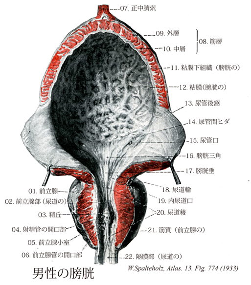 →(膀胱は腎臓で産生され尿管によって送られる尿を約350~500mlまたはそれ以上を一時的に貯える。平滑筋よりなり弾性に富む尿の貯留器官。膀胱は骨盤腔のもっとも前部にあり、恥骨の後ろに位置する。軽度に充満する時には、四面体を呈し、頂にあたるところを膀胱尖といい、錐体の底部にあたるところを膀胱底と呼ぶ。尖と底との間を膀胱体と呼ぶ。)