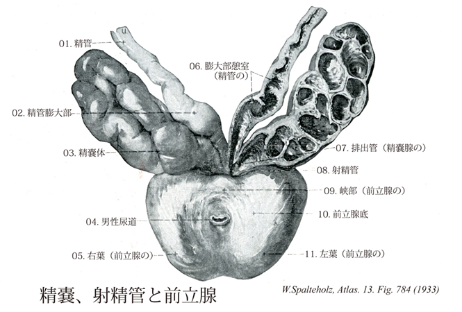 784_00a【Prostate; Prostate gland; Prostatic glands前立腺 Prostata】 Chestnut-sized tubuloalveolar gland below the urinary bladder and having a smooth surface. It surrounds the urethra. →(前立腺は膀胱底の下に密接し、骨盤底の上にのる30~50個の胞状管状腺である。男性の尿道起始部を取り囲んで栗の実に似た形をしている。強靱な結合組織の被膜に被われる。外周に近い部部分は色がやや暗く見え(いわゆる外腺exogland)、中心部は白っぽい(いわゆる内腺endogland)。Prostataはpro(前に)stata(立つもの)という意味である。古代ギリシャでは永来ヒトの前に立って護衛する人をprostatesといったそうである。前立腺を初めて記載し、prostatesと名付けたのは、アレキサンドリア学派のエラシストラトスErasistratus(BC310-250)である。前立腺が膀胱の前に立ってこれを守っていると考えたのだろう。日本では、以前には摂護腺と呼ばれていたが、ギリシャ語の直訳の前立腺が現在では正規の用語になっている。)