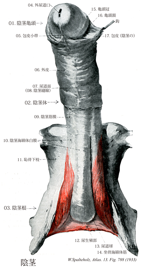 →(陰茎は男性の交接器であるが、泌尿器の一部である尿道をも含む。恥骨に付着する基部が陰茎根で、根より前方の自由部が陰茎体、先端の膨大部が陰茎亀頭、咽頭後縁の高まりを亀頭冠、その後方の溝の部分を亀頭頚という。陰茎上面を陰茎背といい、平たく、下面は尿道が通過する側で、尿道面という。陰茎の主体は、尿道を包む尿道海綿体と、二つの陰茎海綿体である。左右の陰茎海綿体が接着してできる下面の溝に尿道海綿体がはまる。陰茎海綿体の恥骨下枝への付着部を陰茎脚、尿道海綿体の基部のふくらみを尿道球という。亀頭は尿道海綿体が先端でふくらんだものである。各海綿体は結合組織性の強靭な陰茎・尿道海綿体小柱とよばれる平滑筋を含む柱が多数内腔を走る。陰茎海綿体洞には、深陰茎動脈などからの枝であるラセン動脈が直接に流入する。血液が急速に流入すれば、海綿体、海綿体静脈からの血流の還流が妨げられ、海綿体は腫脹して陰茎が膨起する。左右の陰茎海綿体の間の不完全な仕切りを陰茎中隔といい、亀頭内の正中にあるものを亀頭中隔という。三つの海綿体を深陰茎筋膜が共通に包み、さらにその外側を浅陰茎筋膜が包む。陰茎の皮膚はゆるく、前方では二重となってヒダをつくり、これを包皮という。包皮と亀頭下面を結ぶヒダを包皮小帯という。下面には陰嚢縫線につづく陰茎縫線が認められる。亀頭冠には包皮線があり、これは独立皮脂腺である。)