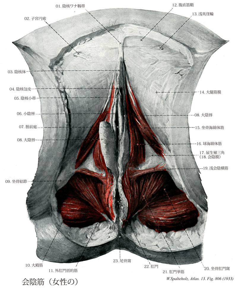 →(骨盤下口を閉ざし肛門および尿生殖洞をを開閉する筋群であり、肛門筋群(1~3)と尿生殖筋群(4~8)とに分けられる。(1)肛門挙筋:小骨盤の内壁からおこり主として肛門につく。閉鎖筋膜からおこる部分は肛門挙筋腱弓をなす。起始と停止の鎖により、腸骨尾骨筋、恥骨尾骨筋、恥骨直腸筋に区分され、また前tなんぶは尿生殖洞にも付着して前立腺挙筋または恥骨腟筋とよばれる。(2)尾骨筋:肛門挙筋の後方で仙棘靱帯の内面にある小筋。(3)外肛門括約筋:肛門挙筋より下方で肛門管を取り囲む輪状の横紋筋である。皮下部、浅部および深部の3部に分けられているが、その境界は不明確である。筋後端と尾骨尖端を結ぶ靱帯を肛門尾骨靱帯という。(4)深会陰横筋:尿生殖三角をふさぐ三角形の筋で、尿道球腺または大膳提瞻をいれている。(5)尿道括約筋:男では尿道隔膜部、女では尿道と腟とをかこむ輪状の筋。(6)浅会陰横筋:深会陰横筋の浅部でその後縁を横走する小筋。(7)坐骨海綿体筋:坐骨枝からおこり、陰茎(陰核)海綿体を包む。(8)球海綿体筋:尿道球または腟前庭を包む筋で、外肛門括約筋とは会陰腱中心を介して連なる。(1)と(2)は陰部神経叢の枝により、また(3)~(8)は陰部神経によりそれぞれ支配される。)