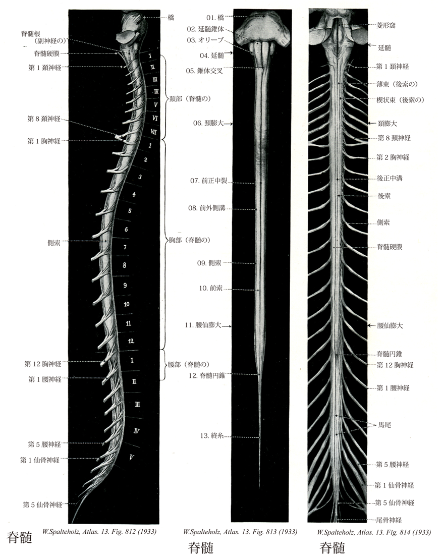 - 813_00【Spinal cord脊髄 Medulla spinalis】 It extends from the end of the medulla oblongata near the exit of the first spinal nerve to the beginning of the terminal filum at L1 or L2.