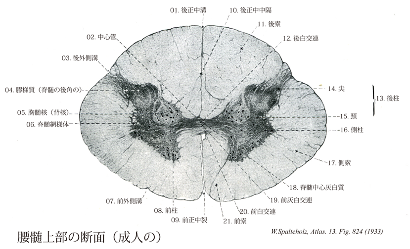 →(腰髄では横断面がほとんど円形である。太い前角と後角があり、白質は、頚髄節よりも相対的にも、絶対的にも少ない。後索を形成構成している薄束はここより上位のレベルにおけるほど広くなく。特に灰白交連の近傍の部分でそうであるし、また著しく特徴的な形をしえちる。よく発達した前角は側索に広がる鈍い突起を持っていて、第三腰髄から第五腰髄でこの突起内にある運動性細胞は下肢の大きな筋群に分布する。上位腰髄(第一、第二腰髄)下位の胸髄節に類似しており、おおきなよく発達した胸髄核や中間質外側部の細胞群が認められる。)