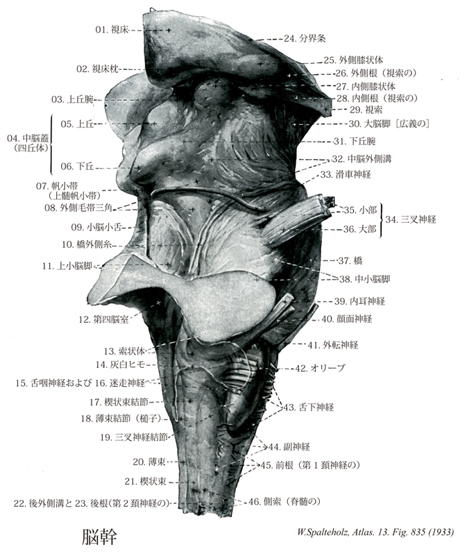 - 835_00【Brain stem脳幹 Truncus encephali】 Collective anatomical term for the rhombencephalon and mesencephalon. The clinical definition includes the basal ganglia, diencephalon, and portions of the 【rhinencephalon】.