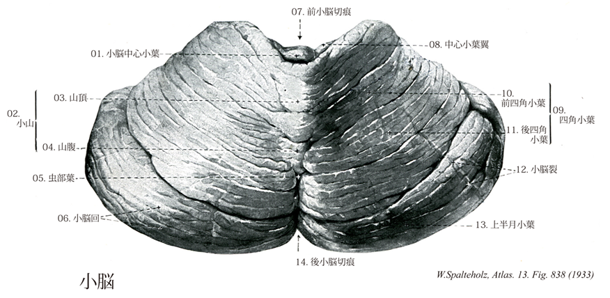 838_00【Cerebellum小脳 Cerebellum】 Part of the brain situated above the rhomboid fossa. →(Cerebellumは、「大脳、脳」を意味するcerebrumの指小形で、「小さい脳」という意味である。Cerebrumは、「頭」を意味するギリシャ語のkararan由来する。 小脳は筋、関節などの深部組織、前庭、視覚、聴覚系などからの入力を直接あるいは間接的に受け、眼球運動を含む身体の運動調節を司る。小脳は正中部の虫部と外側部の小脳半球とに分けられる。いずれも多数の小脳溝により小脳回に細分される。この中、特定の小脳溝は深く、これにより小脳回の集合ができる。これを小脳小葉とよぶ。ヒトでは小脳は深い水平裂により上面と下面とに分けられ、虫部とそれに対応する半球に九つの小葉が区別される。系統発生的には小脳は前葉、後葉、片葉小節葉の3部分に分けられる。前葉は系統発生的に古く古小脳(Paleocerebellum)ともよばれ、脊髄小脳路、副楔状束核小脳路、オリーブ小脳路の一部、網様体小脳路などをうける。後葉は系統発生的に新しく、新小脳(Neocerebellum)とよばれる。とくに半球部は虫部より新しく、橋核、主オリーブ核などを介して大脳皮質と結合している。前葉と後葉とは第1裂により境される。片葉小節葉は原小脳(Archicerebellum)とよばれ最も古く前庭系との結合が著明である。後葉とは後外側裂で境される。後葉には虫部錐体と虫部垂との間に第2裂がある。ヒトの小脳小葉の形は他の動物のものと大きく異なりる。小脳全体は灰白質と白質とからなる。灰白質には小脳皮質と小脳核とがある。小脳皮質は小脳小葉の表面をなし遠心性軸索を出すPurkinje細胞と皮質内での結合を行う細胞とからなる。小脳核は深部にあり、室頂核、球状核、栓状核、歯状核の4核からなる。小脳皮質にはその結合から三つの縦帯が認められる。すなわち、正中部の虫部皮質、外側部の半球皮質および両者の境界部の虫部傍皮質である。虫部皮質のPurkinje細胞は室頂核に、虫部傍皮質は球状核と栓状核に、半球皮質は歯状核に投射する。小脳の中心部の白質塊は髄体とよばれ、遠心性および求心性繊維から出来ている。ここからは白質が分枝して(白質板)、小葉に分かれる。全体として樹の枝のようにみえるので、小脳活樹と名づけられている。小脳は三つの小脳脚により、延髄、橋、中脳と結合している。これは小脳の遠心路および求心路の通路となっている。 小脳の発生 development of the cerebellum:小脳は後脳の菱脳唇から発生する。後脳の菱脳唇は翼板の背外側につづく背内方に突出する高まりで、胎生2ヶ月の後半において急速に増大し、小脳板とよばれるようになる。左右の小脳板の間には菱脳蓋の頭側半分が介在するので、頭側部では左右の小脳板は相接しているが、尾側部では広く離れている。菱脳の中央部を頂点とする橋弯曲が高度になると、この部の菱脳蓋の左右方向の拡大によって、左右の小脳板の尾側部はいよいよ高度に引き離され、左右の小脳板は菱脳の長軸に直角な一直線をなすようになる。これと同時に左右の小脳板の頭側部(今では内側部)が合一するので、結局、正中部が小さくて左右両部が大きい単一の小脳原基が成立する。正中部からは小脳虫部が、左右両部からは小脳半球が形成される。 増大していく小脳原基の背側部には、やがて中部から半球に向かって走る溝が次々に出現して小脳を区画する。胎生5ヶ月のおわりには小脳虫部における10個の主な区分(小脳葉)がほぼ完成する。これらの小脳葉はそれぞれ固有の発育を行うが、その間に第2次、第3次の溝が生じて、各小脳葉を多数の小脳回に分ける。このような形態発生の結果広大な表面積を獲得した小脳の表面には小脳皮質とよばれる特別な灰白質が形成され、これに出入りする神経線維はその深部に集まって小脳白質を形成する。 小脳原基においても菱脳室に接する内側から表面に向かって胚芽層・外套層・縁帯の3層が分化する。胚芽層は神経が細胞をつくりだすが、胚芽層から発生するのは小脳核の神経細胞と小脳皮質のPurkinje細胞およびGolgi細胞である。小脳原基が3層に分化するとまもなく、外套層の表層部にやや大型の神経芽細胞が出現し、小脳板の背側面(表面)に平行に1列にならぶ。これがPurkinje細胞の幼若型である。ついで小脳板の尾側端部の胚芽層でさかんな細胞分裂がおこり、ここで生じた未分化細胞は縁帯の表層部を頭方に遊走して、小脳原位の全表面をおおう未分化細胞層を形成する。これを胎生顆粒層という。 胎生顆粒層の細胞は胚芽層における細胞分裂が終わるころから活発な分裂を開始し、神経細胞をつくりだす。この神経細胞は縁帯およびPurkinje細胞の層を貫いて、Purkinje細胞の層の下に達し、ここに新しい細胞層(内顆粒層)をつくる。胎生顆粒層からは、このほかに縁帯の中に散在する籠細胞や小皮質細胞が生ずる。必要な数の神経細胞を送り出すと胎生顆粒層における分裂はやみ、本層は速やかに消失する。一方、Purkinje細胞は縁帯の中に多数の樹状突起を伸長さ