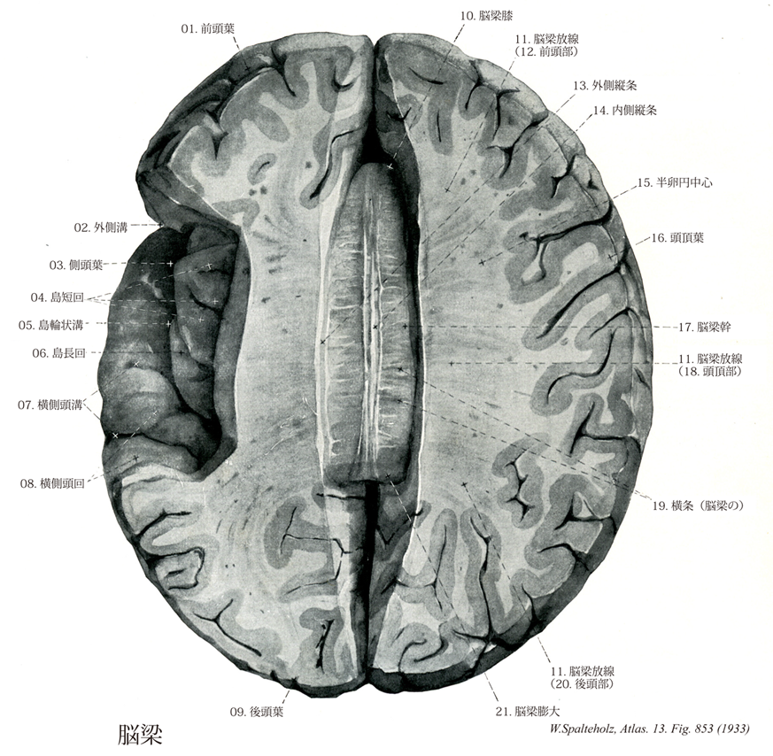 - 853_00【Corpus callosum脳梁 Corpus callosum】 Transverse nerve fibers connecting the two cerebral hemispheres at the base of the longitudinal cerebral fissure.
