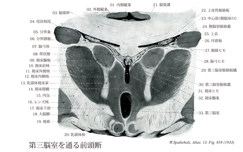 - 858_14【Interthalamic adhesion; Massa intermedia視床間橋;中間質 Adhesio interthalamica; Massa intermedia】 Inconstant fusion (70-85%) of the right and left parts of the thalamus.