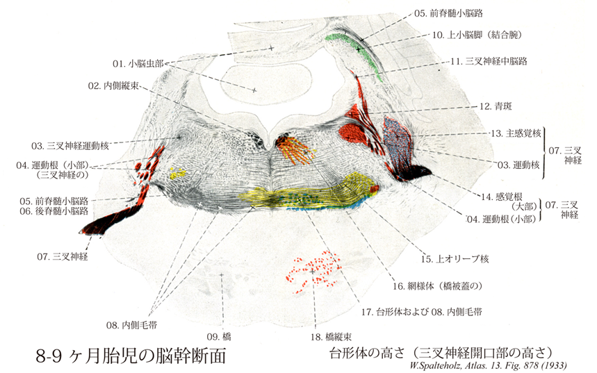 - 878_03【Motor nucleus of trigeminal nerve三叉神経運動核 Nucleus motorius nervi trigemini; Nucleus motorius princeps nervi trigemini】 Motor nucleus for innervation of the muscles of facial expression. It is located laterally, beneath the facial nucleus.