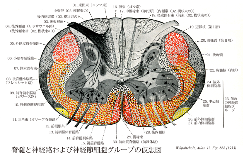 →(第Ⅱ層は後角尖にある、境界の明らかな、かなり幅広い帯状の領域であり、細胞体染色並び髄鞘染色により容易に認められるぎっしりとつまった神経細胞からなる膠様質に相当する。これ第Ⅱ層には2つの領域が認められる。①やや小形の細胞から成る比較的狭い外帯outer zone、②比較的幅広い内帯inner zoneである。そのいずれの領域においてもニューロンは円形ないし、楕円形で長軸を表面に対して放射状に配列している。紡錘状の細胞体の大きさは殆ど同じで、その一方ないし両極から、多くの樹状突起を出している。第Ⅱ層のニューロンは痛覚に関係したかなりの量の神経信号を、後根からの線維群ばかりでなく延髄網様体の下行線維群からも受ける。したがって痛みの調節(セロトニン、ノルエピネフリン、P物質、エンケファリンなど多様な神経伝達物質が使われ、また触覚受容ニューロンも関与するが、第Ⅱ層のなかでおこなわれる。この層内に存在するニューロン細胞体は、軸索突起を、上行性伝導路に直接伸ばすのではなく第Ⅰ・Ⅳ・Ⅴ層ニューロンにシナプス伝達を行うために伸ばすだけである。)