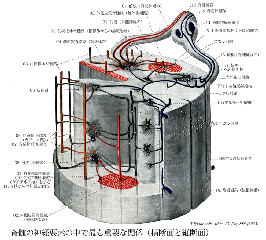 →(白質は主として縦走する有髄線維からなり、灰白質の外方に脊髄索、すなわち前索、後索および側索をつくる。後索は下等動物では発育が悪いが、高等動物、ことにヒトではよく発達し、左右の後索は後正中溝およびそれに続いて正中面にある薄い隔板(後正中中隔)によって分離される。白質には脊髄と脳を結ぶ投射神経路と脊髄の各部を結ぶ連合神経路がある。前者には上行性(知覚性)のものと下行性(運動性)のものがある。)