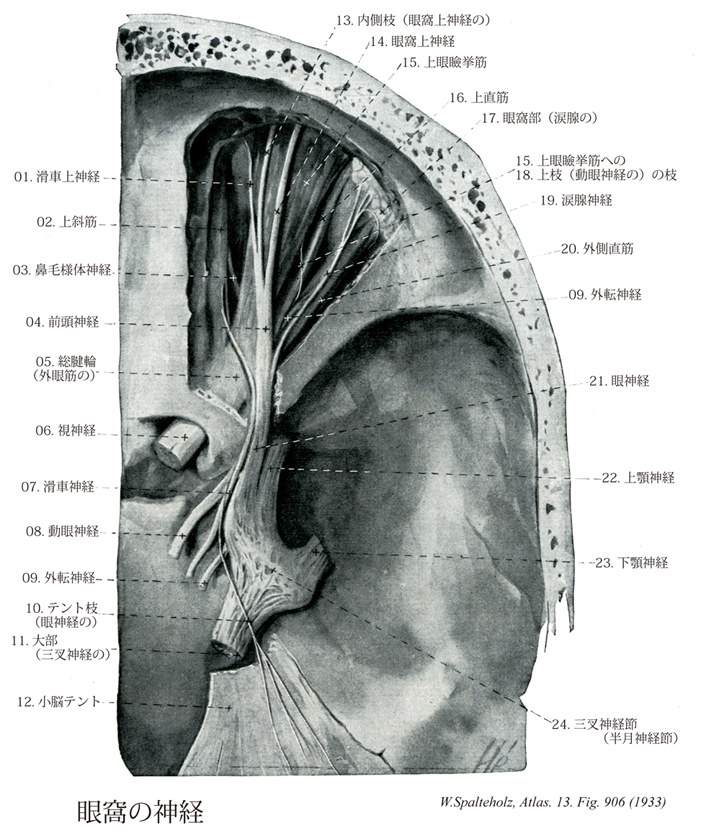 →(眼神経は第五脳神経の第一枝(CN V1)。蝶形骨体上の海綿静脈洞の外側に沿って前方にすすみ、上眼窩裂を通って眼窩に入る。つぎの枝(①涙腺神経、②前頭神経、③鼻毛様体神経)に分かれる。また眼筋にいたる動眼、滑車、外転の3神経および交感神経との間に交通がある。)
