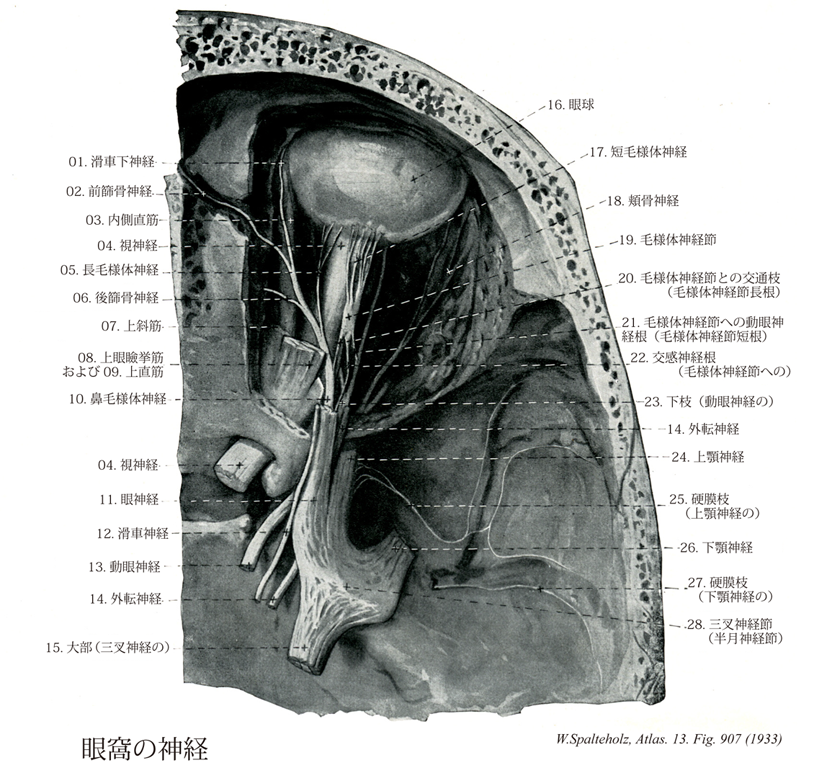 →(眼球、類の、鼻粘膜の一部および鼻背皮膚に分布する鈍知覚神経で、上眼窩裂を通って眼窩に入り視神経と上直筋との間を通って斜めに前内側にすすみ、前篩骨孔のあたりで滑車下神経と前篩骨神経とに分かれる。その経過中に出す枝はつぎのようである。)
