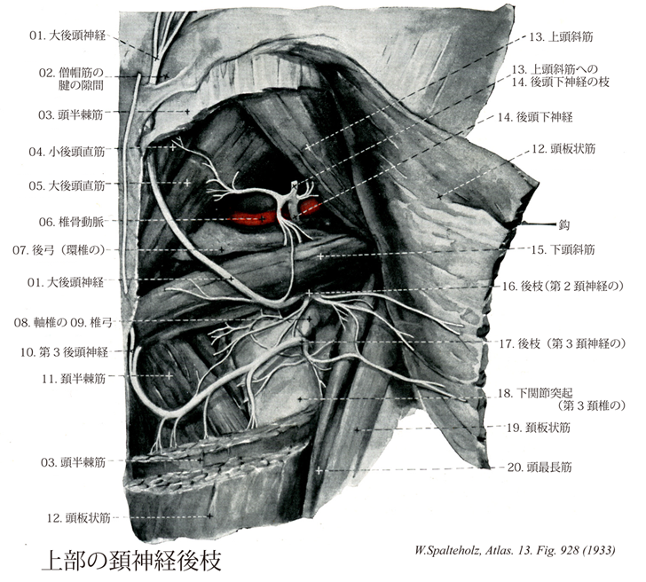 - 928_01Arnold's nerves【Greater occipital nerve大後頭神経 Nervus occipitalis major】 Dorsal branch of the second spinal nerve. It emerges between the axis and obliquus capitis inferior, penetrates the trapezius, and supplies the neck muscles and skin of the occiput up to the vertex.