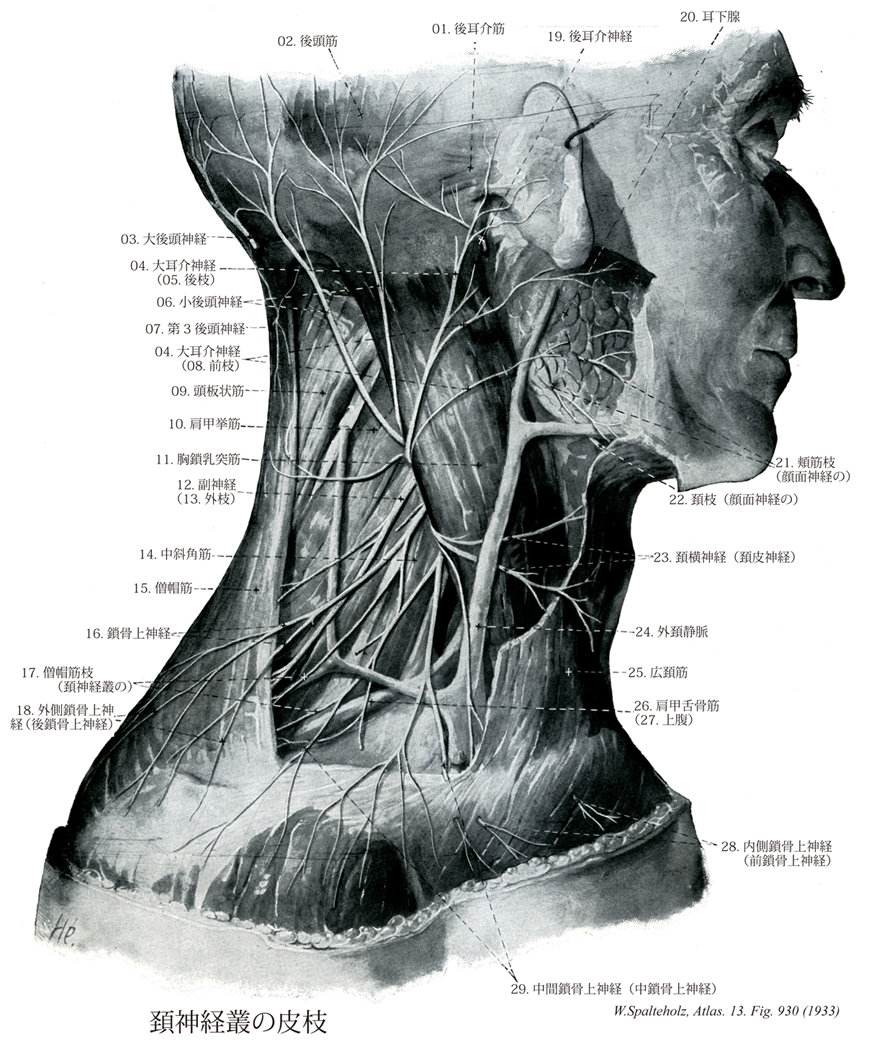 →(第1~4頚神経の前枝が互いにワナをつくる(吻合する)ことにより形成される神経の網目を頚神経叢という。頚神経叢からは頚神経ワナ、横隔神経などの筋枝と、小後頭神経、大耳介神経、頚横神経、鎖骨上神経などの皮枝が出てそれぞれ末梢側におもむく。すなわち頚神経ワナは第1~2頚髄の前角に細胞体をもつ運動ニューロンの神経突起を含み、舌骨下筋群に分布する枝を有している。横隔神経は横隔膜に分布する。一方、皮枝の中に含まれるのは頚神経後根の脊髄神経節に細胞体を有する知覚ニューロンの末梢側突起、すなわち樹状突起にほかならず、これらは後頭部、頚部、および肩の部分の皮膚に分布してそこからの知覚を頚髄に伝える。鎖骨上神経は分布領域のちがいから内側[前]鎖骨上神経、中間鎖骨上神経、および外側[後]鎖骨上神経の三者に区別される。)