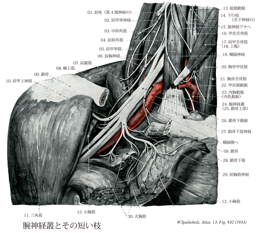 →(腕神経叢は通常第5~8頚神経の全部および第1胸神経の大部分からはじまるが、またしばしば第4頚神経および第2胸神経と細枝で交通する。この神経叢は前斜角筋と中斜角筋との間を通って上内方から下外方に走り、鎖骨の下を通って腋窩に至り、上腕帯および自由上肢部の諸部に枝を与えるもので、脊髄神経叢のなかで最も発育がよい。腕神経叢の出来肩は極めて独特で、まず第5,6頚神経が合して1幹を作り、第7頚神経はそのまま独立に1幹をなし、第8頚神経と第1胸神経と合して1幹を作るが、これをそれぞれ上神経幹、中神経幹および下神経幹という。この3幹はつぎにおのおの前後2枝に分かれるこれらの枝うち、後枝は3本合して1本の後神経束を作り、その延長が橈骨神経となる。前枝は上中2本が合して新たに外側神経束を生じ、下神経幹の前枝はそのまま内側神経束となる。この内外の神経束はおのおの分かれて2枝となり、かくして出来た4枝のなかで中央の2枝が合して正中神経を作り、外側枝は筋皮神経となり、内側枝はさらに分かれて尺骨神経、内側上腕皮神経、内側前腕皮神経の枝となる。腕神経叢をその値する部位により鎖骨上部と鎖骨下部とに分ける。鎖骨上部は鎖骨上窩で胸鎖乳突筋下部の後にあり、鎖骨下部は鎖骨下で大小両胸筋に被われて腋窩に至る。)