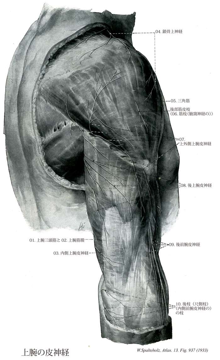 - 937_08【Posterior cutaneous nerve of arm; Posterior brachial cutaneous nerve後上腕皮神経;背側上腕皮神経 Nervus cutaneus brachii posterior; Nervus cutaneus brachii dorsalis】 Small cutaneous branch on the extensor side of the arm.