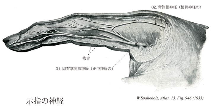 946_01【Proper palmar digital nerves固有掌側指神経(正中神経の) Nervi digitales palmares proprii; Nervi digitales volares proprii】 Terminal branches of the common palmar digital nerves. They supply the skin of the palmar side of the radial 3'A fingers and the skin of the dorsal side of the 2'A radial distal phalanges. →(固有掌側指神経は総掌側指神経の終糸。掌側では橈側3と1/2指の皮膚を、背側では橈側2と1/2指の皮膚を支配する。)
