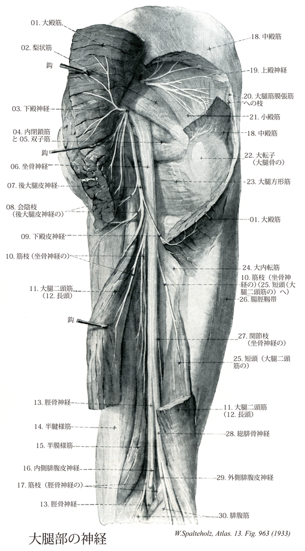 →(坐骨神経は人体中最大の神経であり、仙骨神経叢をつくる神経線維の大部分がこれの構成にあずかる。梨状筋の下で大坐骨孔を出てから大腿の後側を通り、筋枝をすべての大腿屈筋群にあたえたのち、膝窩のやや上方で総腓骨神経と脛骨神経とに分かれる。総腓骨神経は大腿二頭筋長頭の内側縁に沿って下り、腓骨上端の外側で次の終枝に分かれる。①外側皮腹皮神経(下腿外側面の皮膚に分布)、②深腓骨神経(下腿の伸筋群と足背の諸筋、および足背の皮膚に分布)、③浅腓骨神経(長腓骨筋、短腓骨筋への筋枝を出したあと内側足背皮神経、中間足背皮神経、足背趾神経となって足背の皮膚に分布)。脛骨神経は下腿の屈筋群、足底の諸筋、下腿の後面と足底の皮膚に分布するが、次の神経はいずれも脛骨神経の末梢枝である。①下腿骨間神経(下腿骨間膜の後縁に沿って走り、足関節のあたりに達する)、②内側皮腹皮神経、腓腹神経、外側足背神経(ひとつづきのもので下腿後面から足背外側部の皮膚に分布)、③内側足底神経と外側足底神経(ともに足底の諸筋に分布する枝を出したあと、趾の足底面や足底の皮膚に分布するため、総底側趾神経に枝分かれし、固有底側趾神経となっておわる)。)