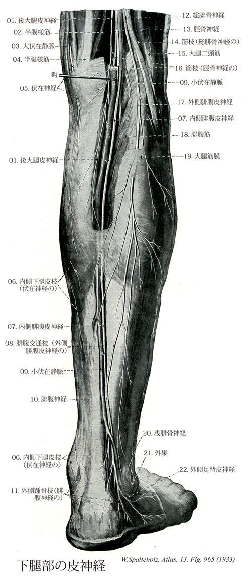 - 965_17【Lateral sural cutaneous nerve外側腓腹皮神経;腓側腓腹皮神経 Nervus cutaneus surae lateralis; Nervus cutaneus surae fibularis】 Nerve given off in the popliteal fossa that supplies the skin of the lateral side of the leg as well as the upper two-thirds of its posterior side.