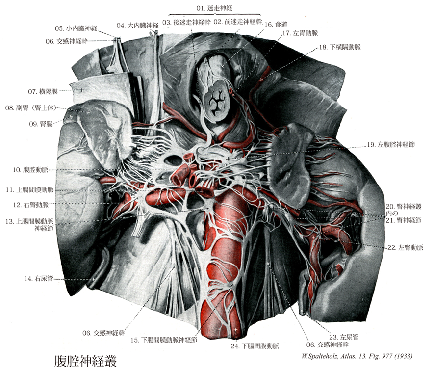 →(腹腔動脈周囲の自律神経叢。左右の腹腔神経節celiac ggl.(太陽神経節solar ggl.)とこれを結ぶ神経網からなる。大・小内臓神経(交感神経)や迷走神経(副交感神経)の線維を受け、胃・肝・膵・脾・腎臓などに線維を送る。膵癌などで激痛がある場合、交感神経に含まれる感覚線維を遮断する目的で腹腔神経叢ブロックを行うことがある。(イラスト解剖学))