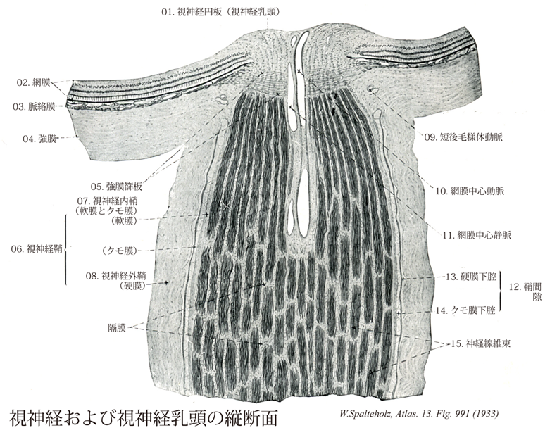 - 991_12【Subarachnoid space of optic nerve; Leptomeningeal space of optic nerve鞘間隙;クモ膜下腔鞘間隙;軟膜腔(視神経の) Spatium intervaginale subarachnoidale nervus optici; Spatium leptomeningeum nervus optici】 Subarachnoid space around the optic nerve and the capillary layer between arachnoid and dura mater.