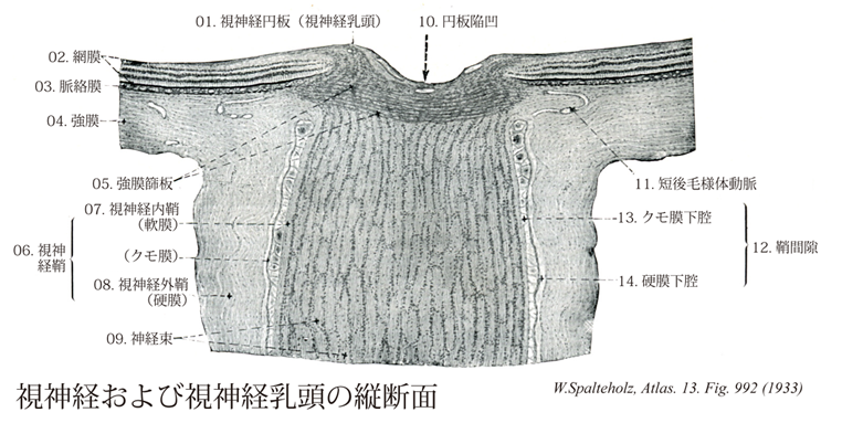 - 992_12【Subarachnoid space of optic nerve; Leptomeningeal space of optic nerve鞘間隙;クモ膜下腔鞘間隙;軟膜腔(視神経の) Spatium intervaginale subarachnoidale nervus optici; Spatium leptomeningeum nervus optici】 Subarachnoid space around the optic nerve and the capillary layer between arachnoid and dura mater.