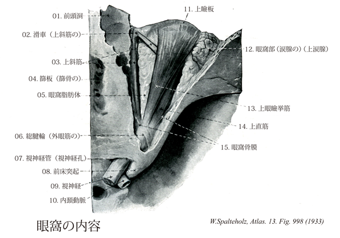 →(上斜筋は眼窩傍結合組織すなわち視神経鞘と(おもに)蝶形骨体の結合組織である総腱輪の内側から起こる。上斜筋は眼窩錐体の内側直近の上を前方に走行する。眼球の縁で上斜筋の丸みのある腱は結合組織性の吊り索(滑車)を通過し鋭角で後方に曲がる。さらに上斜筋の腱は上直筋の下でこれと交差し眼球上後側頭部の強膜に停止する。目の動き:視線を内側かつ下方に向ける。)