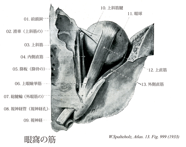 - 999_03【Superior oblique muscle上斜筋;上眼球斜筋 Musculus obliquus superior; Musculus obliquus bulbi superior】 o:Medial to the common tendinous ring on the body of sphenoid, i: After a hook-shaped course, obliquely behind the equator. Its tendon passes through the trochlea. Action: Abduction, intorsion, and depression of the eye. I: Trochlear nerve.
